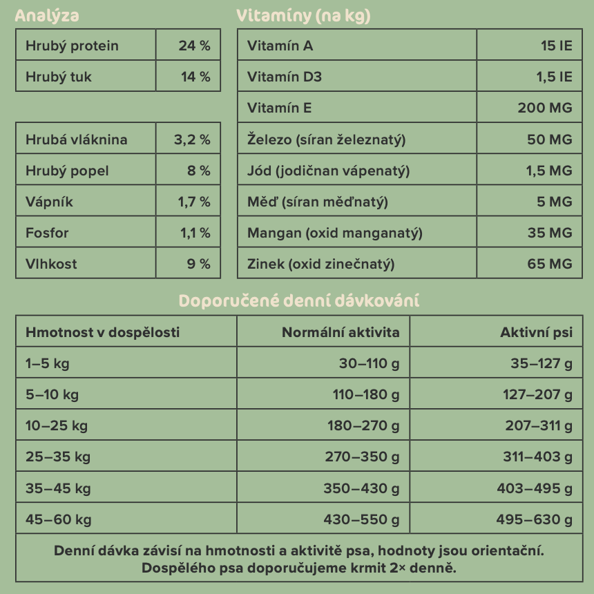 Vyvážený obsah bílkovin (24 %) a tuků (14 %)