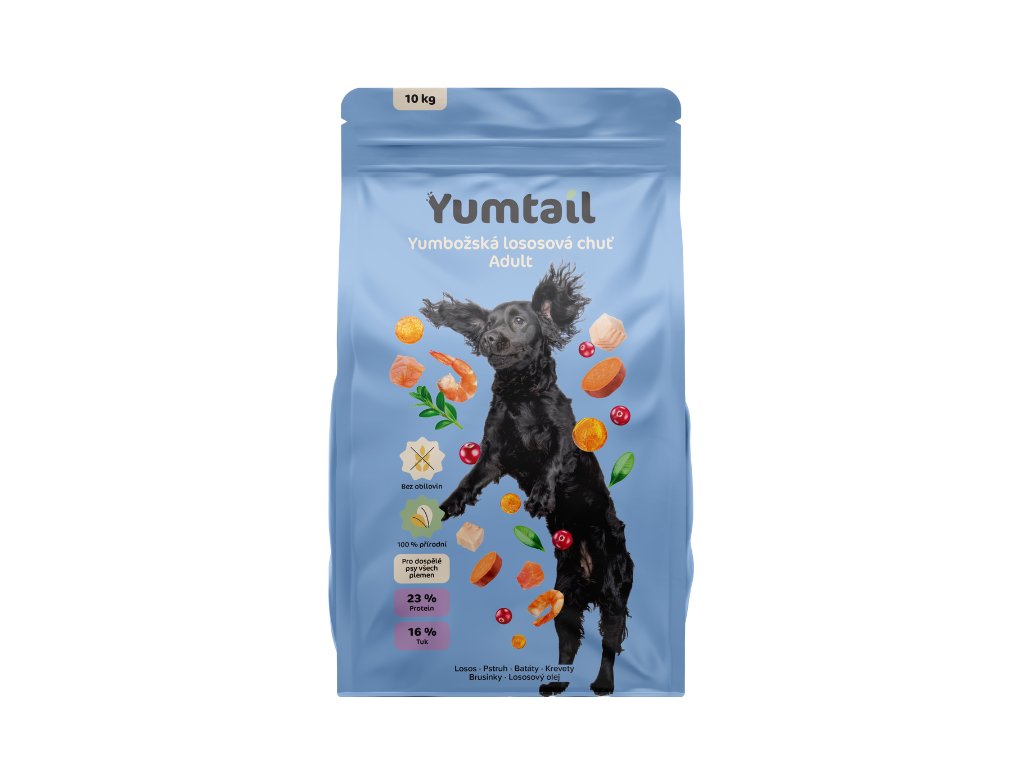Yumbožská lososová chuť Adult je kompletní prémiové krmivo pro dospělé psy všech plemen, které zaujme chutí i složením. Obiloviny jsou nahrazeny kombinací brambor (21 %) a batátů (20 %), čímž se eliminuje riziko lepkové intolerance a podporuje zdravé trávení. Hlavním zdrojem bílkovin je kvalitní sušený losos (19 %), doplněný pstruhem (4 %) a krevetami (2 %), které dodávají krmivu výjimečnou chuť a vysokou nutriční hodnotu. Receptura je obohacena o rajčata, mrkev, brusinky a vlákninu pro podporu zažívání, stejně jako o lososový a lněný olej, které prospívají zdravé kůži a krásně lesklé srsti. Díky přidanému glukosaminu a chondroitinu pečuje také o klouby a pohybový aparát psa. Krmivo obsahuje vitamíny (A, D3, E) a klíčové minerály (železo, jód, měď, mangan, zinek, vápník a fosfor), které podporují imunitu, vitalitu a celkové zdraví. Konzervováno je pouze antioxidanty a látkami schválenými pro použití v krmivech, takže si můžete být jistí jeho bezpečností i kvalitou.